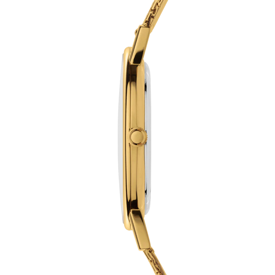The discrete and prize-winning Classic designed by Ole Mathiesen in 1962. In  goldplated with ultra-thin Swiss quartz movement, white dial with Roman numerals, scratchproof convex sapphire crystal and goldplated bracelet.