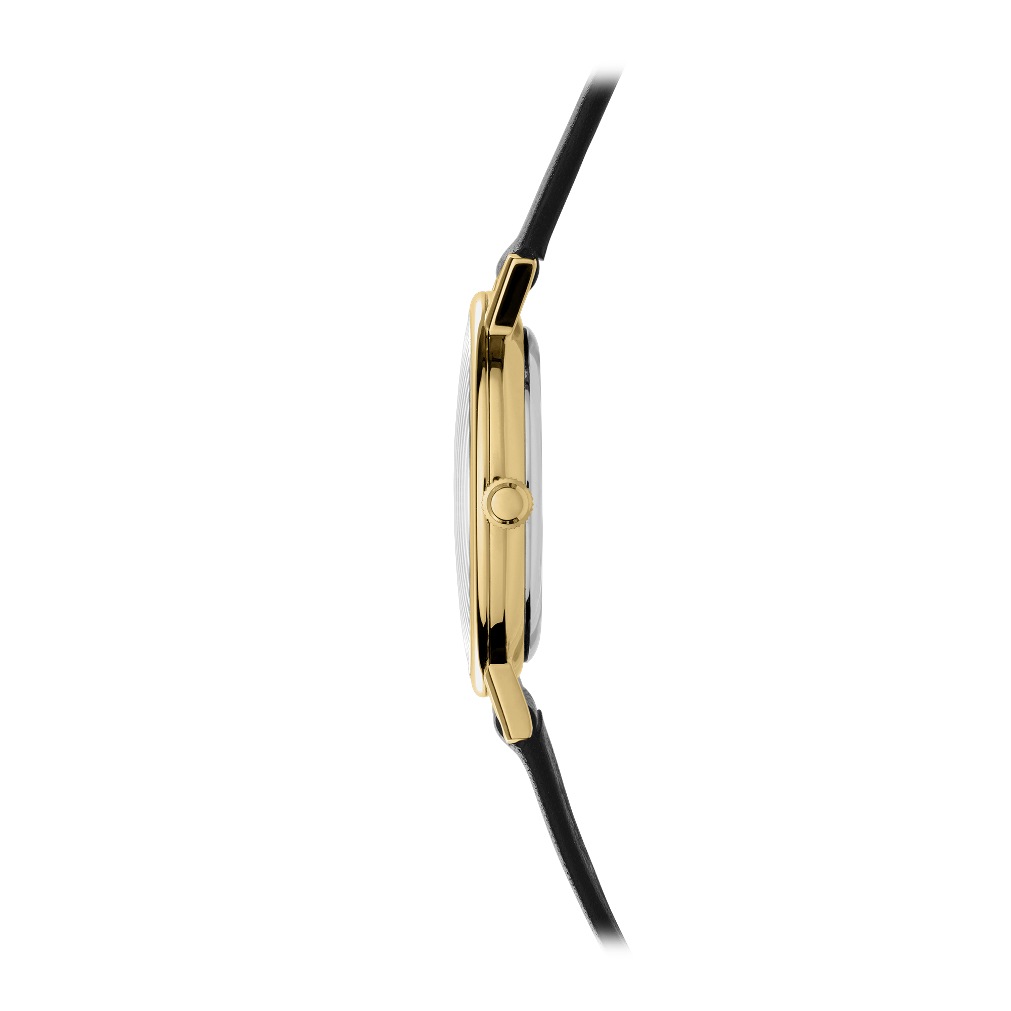 The discrete and prize-winning Classic designed by Ole Mathiesen in 1962. In  goldplated with ultra-thin Swiss quartz movement, white dial with line index, scratchproof convex sapphire crystal and black leather strap.